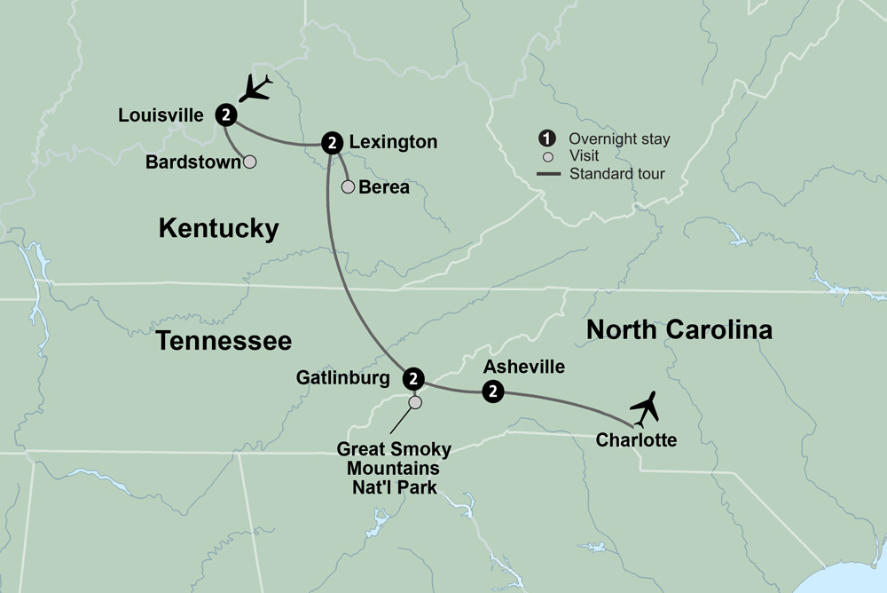 Your tour concludes in Asheville. Proceed to Charlotte, about a two-hour drive, for your flight home.(B)